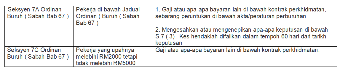 Selaras dengan kuasa yang diberikan oleh Pengarah Tenaga Kerja melalui peruntukan khusus di bawah Ordinan Buruh ( Sabah Bab 67 ) , pekerja mempunyai hak untuk memfailkan tuntutan melibatkan pertikaian seperti berikut :